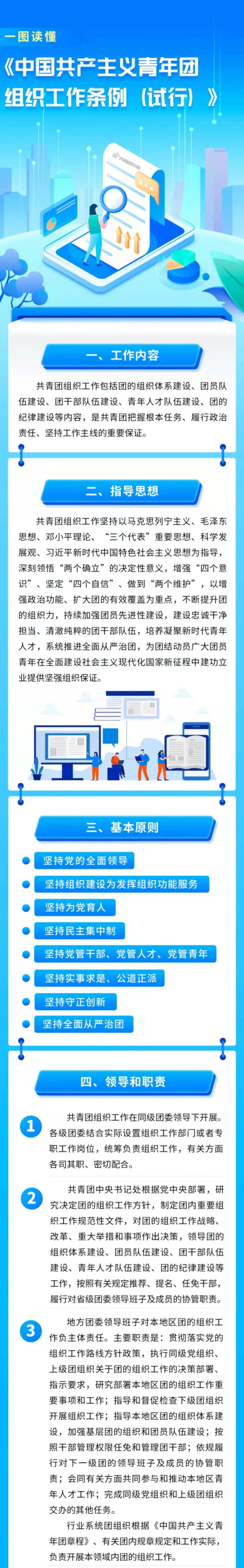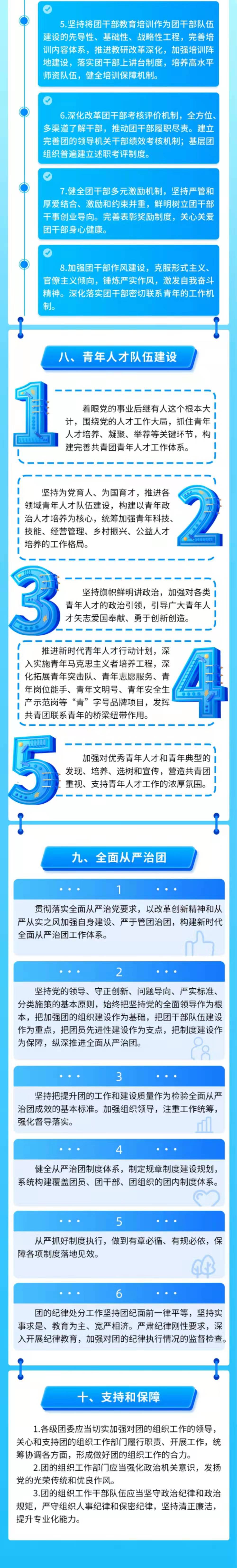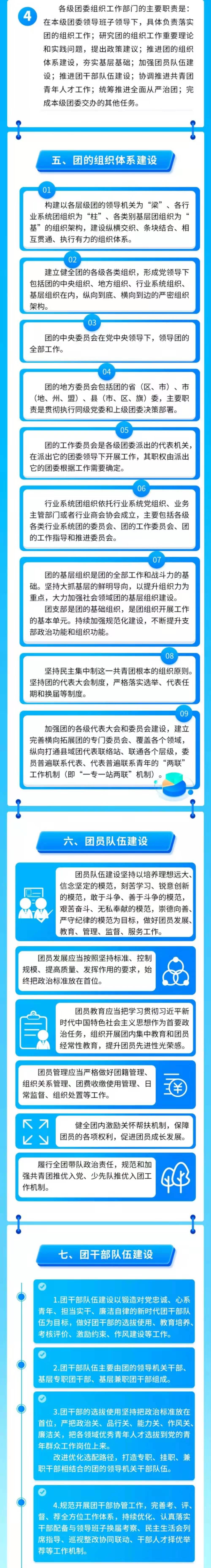 《条例》共分为九个章节,从领导和职责、团的组织体系建设、团员队伍建设、团干部队伍建设、青年人才队伍建设、全面从严治团、支持和保障等方面作出规定。
