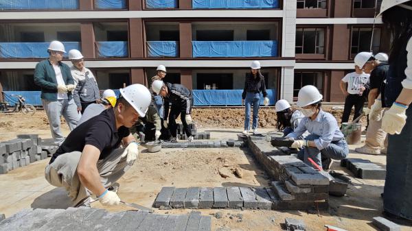 在工人师傅的带领下,大家实地学习给排水施工、砌筑砖墙施工工艺,并现场分组砌筑砖墙?;疃殖∪然鸪欤河械呐械哪ㄋ?,有的砌砖……大家分工配合,井然有序。