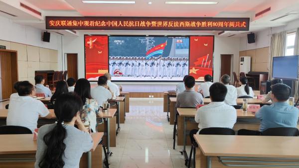 9月3日上午9时,安庆联通组织全体员工共同观看了纪念中国人民抗日战争暨世界反法西斯战争胜利80周年的盛大阅兵仪式。大家认真聆听习近平总书记发表的重要讲话,并全程观看阅兵盛况。