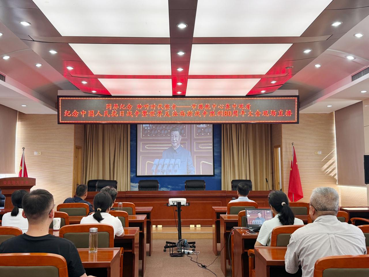 为纪念中国人民抗日战争暨世界反法西斯战争胜利80周年,弘扬伟大抗战精神,,彰显中国作为世界反法西斯战争东方主战场的历史地位与卓越贡献,9月3日上午,安庆市港航管理服务中心组织全体干部职工在七楼会议室集中收看“九三”阅兵盛况直播。