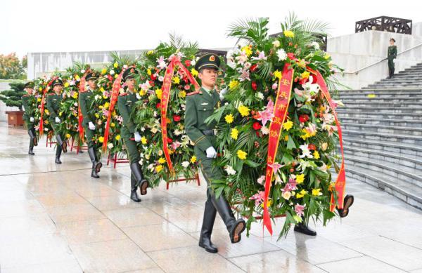 随后,在深情的《献花曲》中,10名礼兵稳稳抬起花篮,缓步走向烈士纪念雕像,将花篮整齐摆放在纪念雕像基座上。