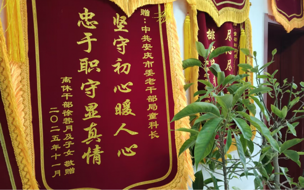 近日,安庆市委老干部局机关党支部书记、服务保障科科长童劲松再次收到服务对象送来的锦旗,锦旗上“坚守初心暖人心,忠于职守显真情”的金色大字熠熠生辉。这已是他转岗从事老干部服务保障工作以来获得的第七面锦旗,见证了其扎根一线、倾情奉献的坚守。